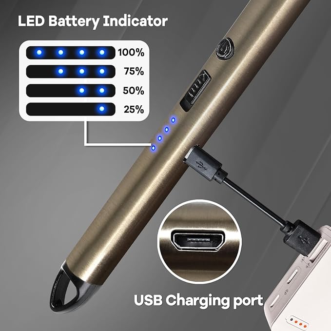 - USB RECHARGEABLE - The Lighters can be used 600 times on a single charge which display real-time battery volume. The 4 LED POWER INDICATOR guarantees that you are always aware of the battery level, so that you are not caught off guard by a draining battery