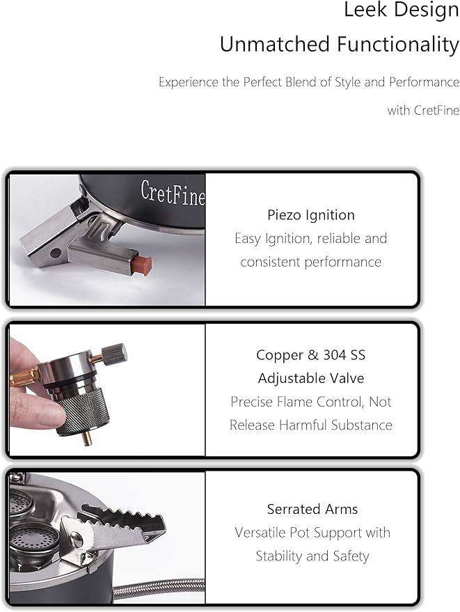 - 🔥【Versatile Gas Adapted】: The CretFine hiking stove effortlessly adapts to any 7/16 (EN 417) thread propane, butane, or isobutane fuel canisters with the included 2 adapters. Enjoy the freedom to choose your preferred fuel source for a seamless outdoor cooking experience with this backpack stove.