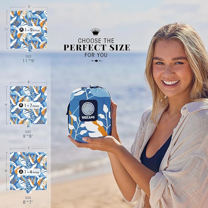 - SIMPLE DESIGN & DOUBLE ANCHORED-WEKAPO beach blanket is designed as simple as possible so it has eliminated 5 sticking out sand pockets and added 4 corner pockets that can be used for storage or sand anchor. If it's windy day, it can be nailed down on beach by metal stakes coming with our blanket.