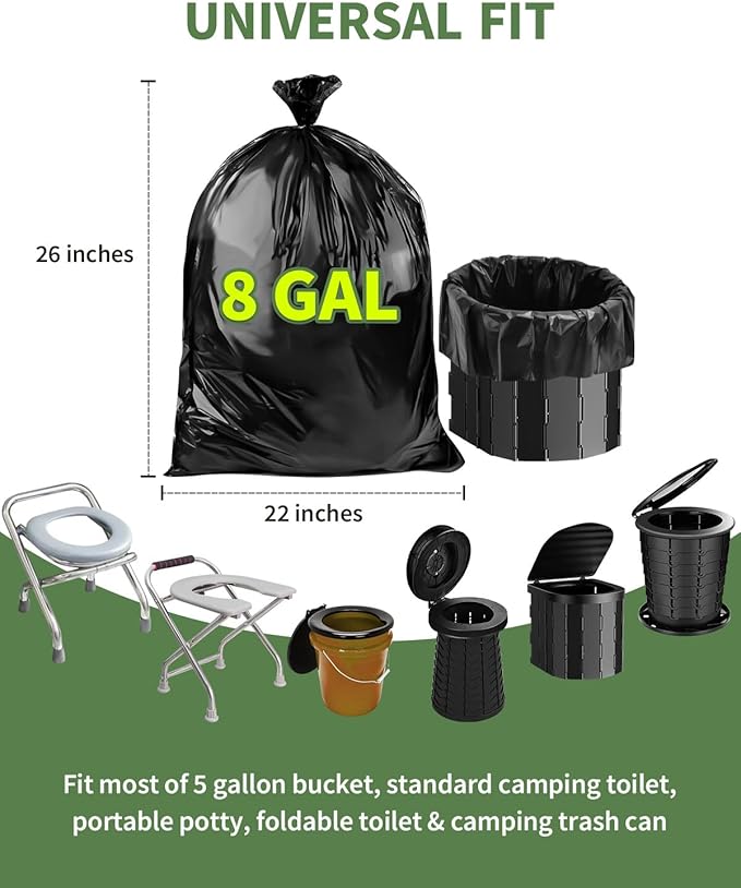 - πππππ ππππππππ & ππππ πππ π ππ - 50 pcs toilet bag, Size 22 x 26 inches, 8 gallon/30L large capacity which are perfect for the most common 5 gallon bucket and trash cans. Plus, these compostable toilet bag are also the best choice for portable potty, bucket toilet seat liner, portable toilet seat, 5-7 gallon garbage bin and more.