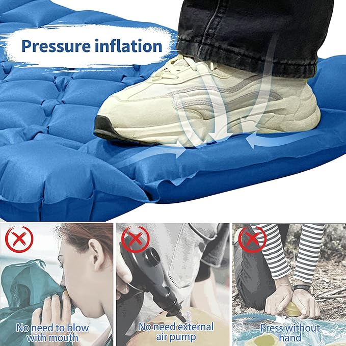 - [Easy Inflation with Built-in Pump] -The camping sleeping mat is equipped with a built-in foot pump, so there is no need for an pump or manual blowing, it can be fully inflated in just one minute by stepping on the foot, and the special deflation valve ensures fast deflation. After a hard day's travelling, you can sleep peacefully, reducing the time and effort needed to inflate your sleeping pad.Note: Please close the deflation valve on the pillow before inflating to avoid air leakage.
