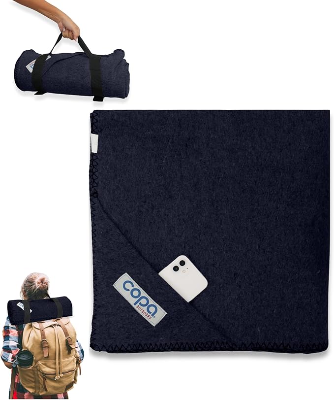 copa Outdoors Extra Large 4.5 lbs Wool Blanket 90"x66" Camping Blanket Thick Outdoor Blanket w Carry Strap and Front Cell Phone Pocket Camping Blankets for Cold Weather