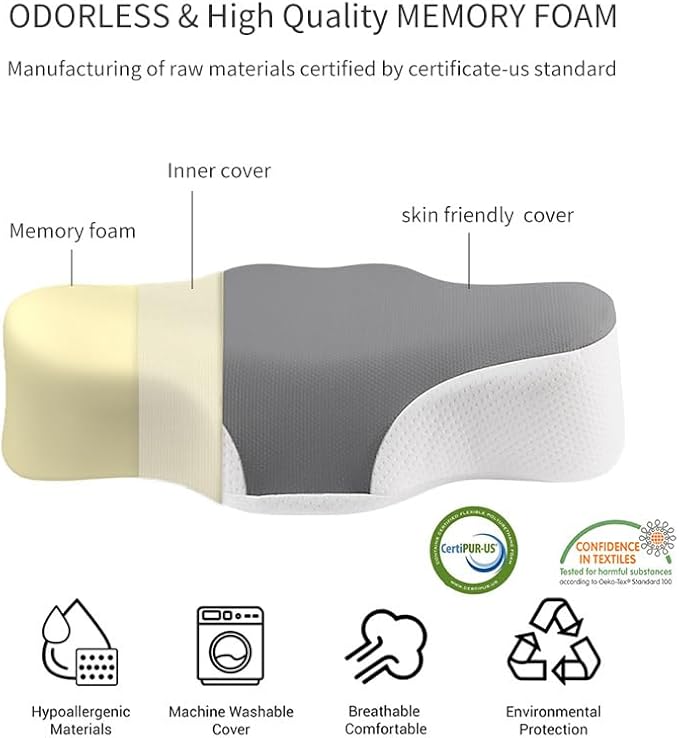 - Premium Quality and Safety - Our neck pillow is crafted using premium CertiPUR-US certified memory foam, ensuring exceptional quality and safety. Additionally, it is further validated by the prestigious OKO-TEX-100 certification, guaranteeing purity and safety.