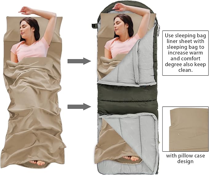 - 💜【SKIN-FRIENDLY SOFT】Our sleeping bag liner is made of polyester fibre material, which is soft and breathable, and the fabric is not wrinkled, balled or faded, so it can be used for a long time. It can be used as a travel sheet, lightweight sleeping bag, travelling sleeping bag.