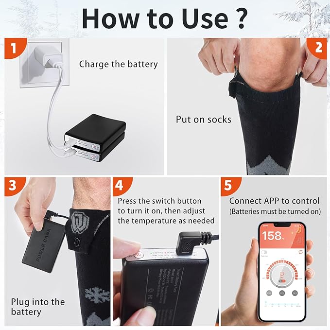 - 【𝐁𝐞𝐬𝐭 𝐂𝐡𝐫𝐢𝐬𝐭𝐦𝐚𝐬 𝐆𝐢𝐟𝐭 𝐟𝐨𝐫 𝐘𝐨𝐮𝐫 𝐋𝐨𝐯𝐞𝐝 𝐎𝐧𝐞𝐬】Featuring 4 heat settings and up to 10.5 hours of battery life,the rechargeable heated socks for men and women is a cozy pair of socks to wear around the house or lodge, to winter sports, or on skiing,ice fishing,hiking,camping,hunting or outdoor work in cold weather.Made for both men and women, the electric heated socks is a perfect gift for a warm winter to your parents, friends and loved ones.