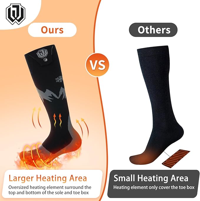 - 【𝐋𝐚𝐫𝐠𝐞𝐫 𝐇𝐞𝐚𝐭𝐢𝐧𝐠 𝐀𝐫𝐞𝐚 & 𝐖𝐚𝐬𝐡𝐚𝐛𝐥𝐞】Our electric heated socks boast an oversized heating element that wraps completely around the top and bottom of the sole and toe box, ensuring more intense and consistent warmth for your entire feet. Benefited from the excellent material construction,the rechargeable heated socks ensure a good fit and more moisture-wicking and air-permeable than cotton,and these heated socks can be washed by machine or hand(with batteries removed first).