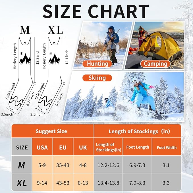 - 【𝟐 𝐒𝐢𝐳𝐞𝐬 𝐀𝐯𝐚𝐢𝐥𝐚𝐛𝐥𝐞 & 𝐄𝐱𝐜𝐞𝐥𝐥𝐞𝐧𝐭 𝐄𝐥𝐚𝐬𝐭𝐢𝐜𝐢𝐭𝐲】Boasting slim batteries and a soft, comfy feel, our rechargeable and washable heated socks not only provide evenly distributed heat that won't falter in icy conditions,but also comfortably cushioned, with excellent compression on the calves.With excellent elasticity,these socks have 2 sizes available--M & XL.we recommend M size for 5-9, XL size for 9-14.