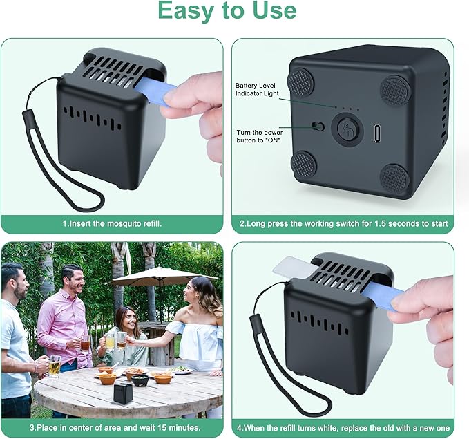 - 【HEAT-ACTIVATED TECHNOLOGY】This Outdoor Mosquito Repellent is Powered by a safe rechargeable battery. It provides 4 hours of continuous mosquito protection on a charge and fully charged in 4 hours. Type-C charging cable included. Wait for 15 minutes to achieve full effect.