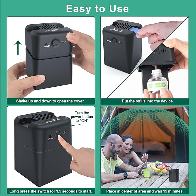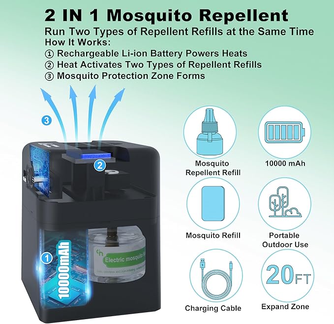 - 【EFFECTIVE MOSQUITO PROTECTION】 Q5 Rechargeable Mosquito Repeller creates a 20-foot mosquito protection zone by heating the effective repellent ingredient. One-button to keeps mosquitoes away. Perfect for the patio, backyard, poolside, decks, porches, camping and other indoor outdoor activities.