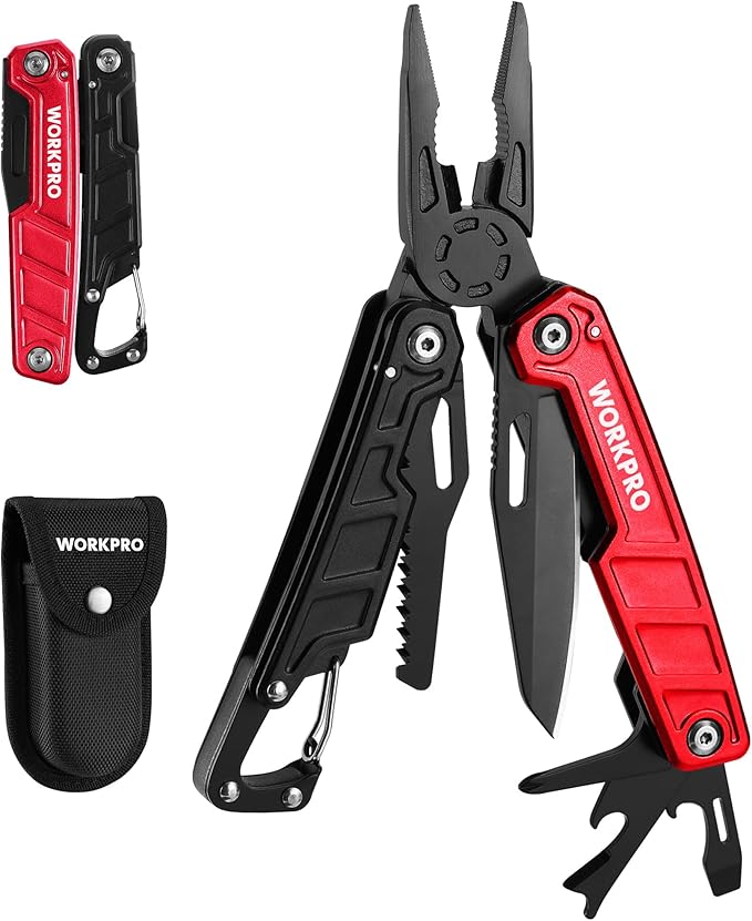 WORKPRO Multitool-11 in 1 Multitool Pliers with Pocket Clip and Sheath-EDC Multi Tool Knives with Safety Lock-Camping Tools Pocket Knife with Screwdriver Saw Blade Wire Cutter and Bottle Opener-Red