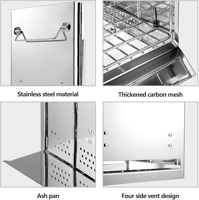 - Contains a rocket stove, a ash pan, a grill, a handbag, no need to disassemble, ready to use. Don't worry about not being able to use it after deformation.
