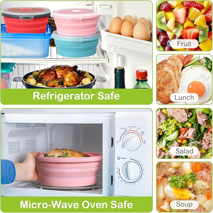 - Microwave, Fridge and Dishwasher Safe: these collapsible bowls with lids for camping accessories can heat in the microwave, or pour the rest of the food into these collapsible food storage containers with lids and put it in the fridge again; These collapsible kitchen items work as indoor and outdoor food storage containers, RV storage supplies, camping kitchen accessories, motorhome accessories for inside