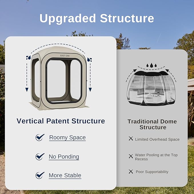 - ๐๐๐ด๐-๐ฃ๐ฟ๐ผ๐ผ๐ณ ๏ผ ๐ฉ๐ฒ๐ป๐๐ถ๐น๐ฎ๐๐ฒ๐ฑ ๐ฆ๐ฝ๐ฎ๐ฐ๐ฒ : The EAST OAK portable pop-up screen tent features a 4-sided B3 fine mesh design for 360ยฐ perfect ventilation and can protect you from mosquitoes or other bugs. The tent body is made of high-quality Oxford fabric coated with silver to achieve all-day UPF 50+ UV resistance. Ideal for creating a comfortable and protected resting space during various outdoor activities (picnics, camping)