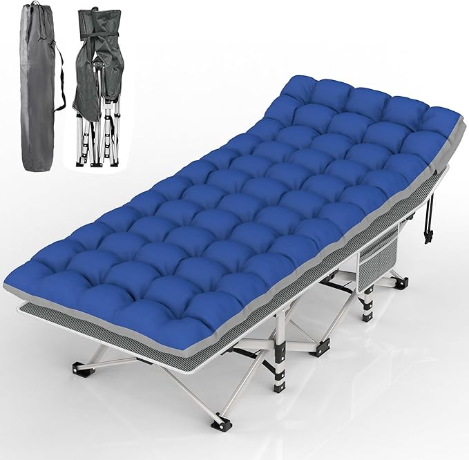 Suteck Camping Cot, Folding Camping Cot Bed for Adults Sleeping 1200D Double Layer Oxford Portable Folding Outdoor Cots for Camping W/Soft Pad Carry Bag for Home Office Nap Beach Travel, Stripe Blue