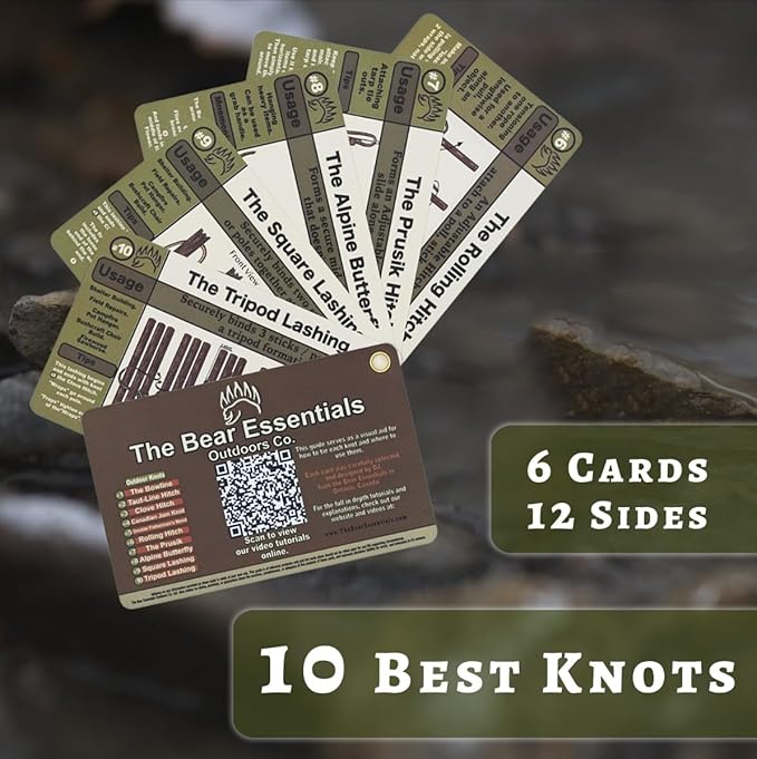 - Choose the Perfect Kit: This Bear Essentials Outdoors Knot Tying Kit features a credit card-sized knot cards, perfect for on-the-go reference. Each set of knot tying cards features the ten essential outdoors knots - bowline knot, taut line hitch, clove hitch, Canadian jam knot, double fishermans bend, rolling hitch, prusik, alpine butterfly, square lashing, and tripod lashing.