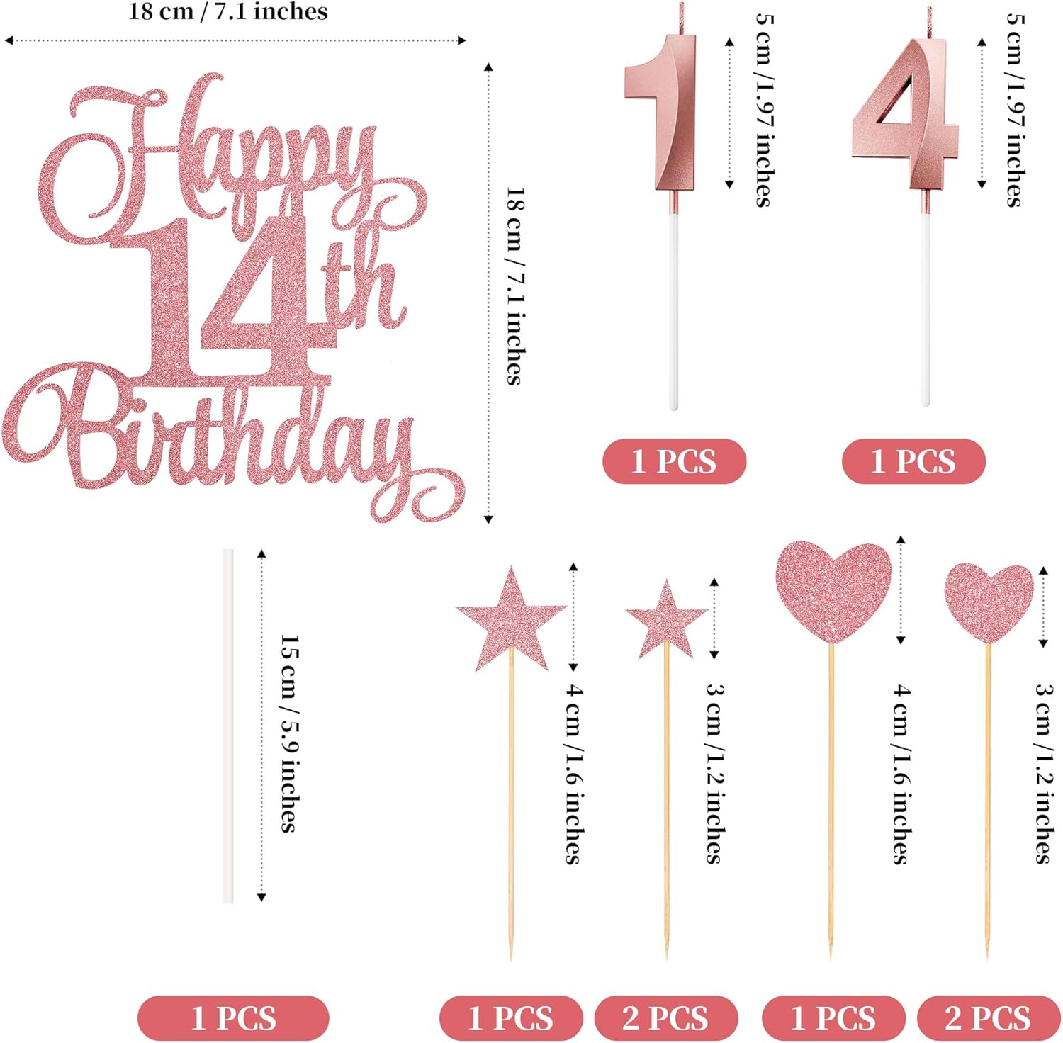 - Package content: you will receive 1 piece happy 14th birthday topper, 3 pieces star cake toppers, 3 pieces heart cake toppers and 2 pieces numeral candles, it's a great addition to the 14th birthday party and anniversary party