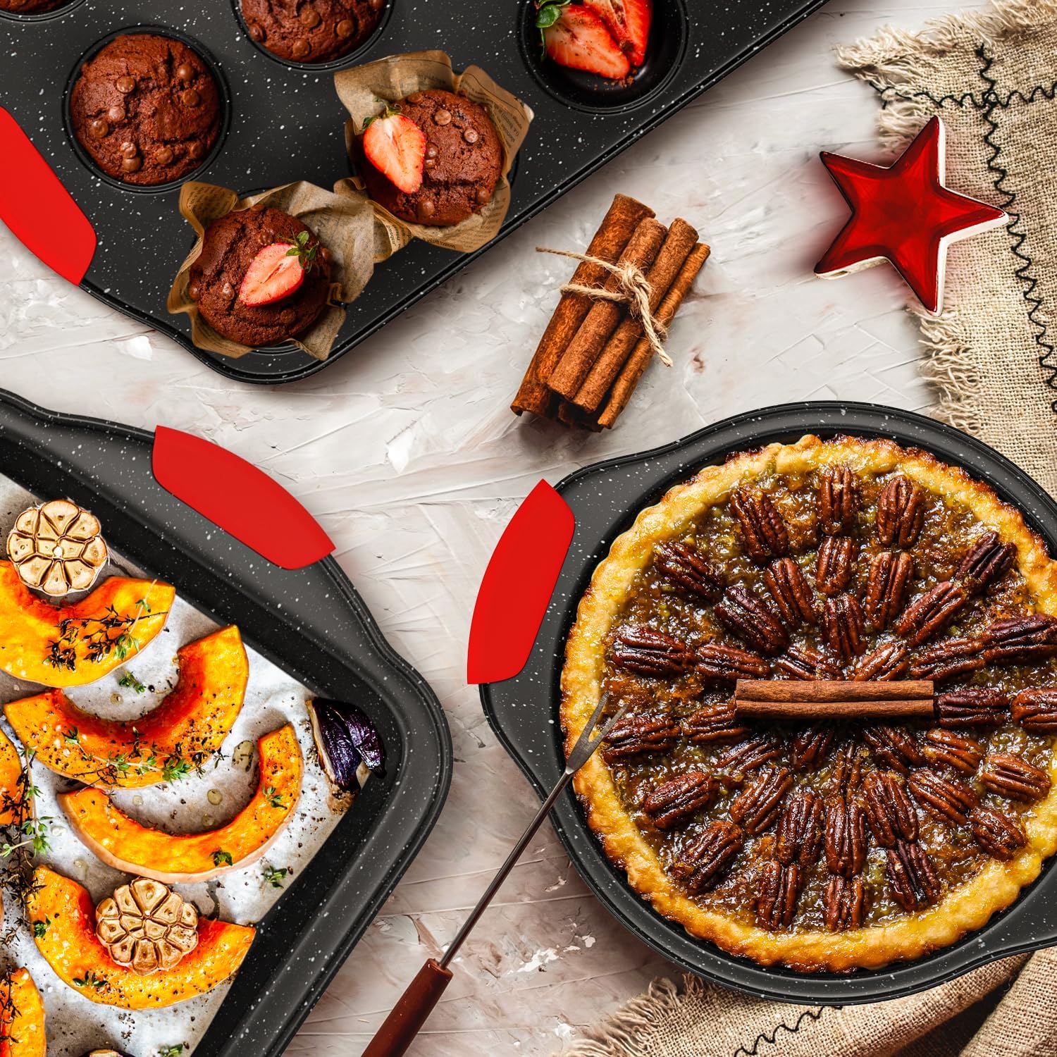 11-Piece Nonstick Stackable Baking Pans Set, Toxin-Free Bakeware Sets, Baking Pan Set with Silicone Handles, Includes Cookie Sheets, Loaf Pan, Pizza Pan, Muffin Pan, Red&Black