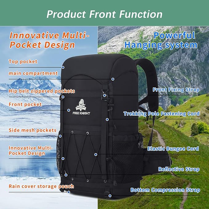 - Multi Compartment: Generous main compartments and multiple pockets keep all your gear safe and organised. The spacious main compartment can holds sleepingbag, clothes or other everyday essentials. With an internal pocket for water bladder. There is also a front zip pocket. The elastic cord is designed to store items that need to be easily accessible. It also has two side pockets for your water bottle or umbrella.