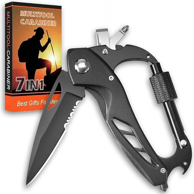 Carabiner Multitool 7-in-1, Carabiner with Pocket Knife, Serrated Folding Knife, Rope Cutter, Bottle Opener, Window Breaker, Screwdriver, Unique Gifts for Men, Outdoor Survival Gear, Camping Hiking