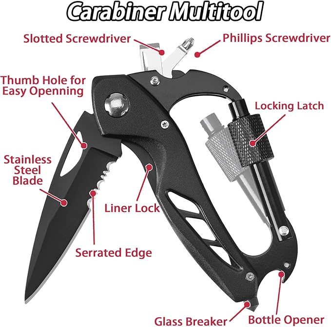 - PERFECT GIFT: Combining practicality and convenience, this tactical carabiner multitool is a must-have survival companion for outdoor enthusiasts. It makes an ideal gift for men, friends, family, and loved ones. If you have any questions, please feel free to contact us directly.