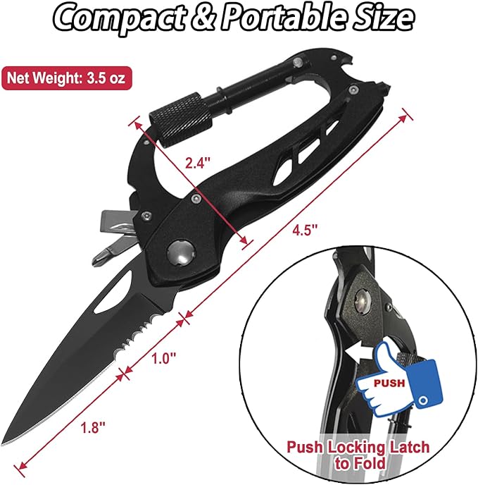 - SMART-SIZE and CONVENIENT: The knife carabiner is smartly sized at 4.5x2.4" (unfolded size 7.3x2.4") and lightweight at just 3.5oz. This EDC multitool at hand can be easily attached to a backpack, keychain, or belt loop, making it perfect for hanging hammocks, setting up tents, hunting. Note: It is not designed to support human weight during climbing.