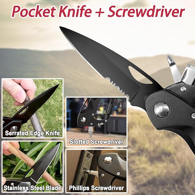 - 7-IN-1 MULTITOOL: Carabiner multitool combines 7 essential functions in one handy device. Including a folding pocket knife with a sharp blade and serrated edge, bottle opener, glass breaker, screwdrivers, and a keychain clip, it is an essential piece of survival gear for outdoor adventures and everyday tasks.