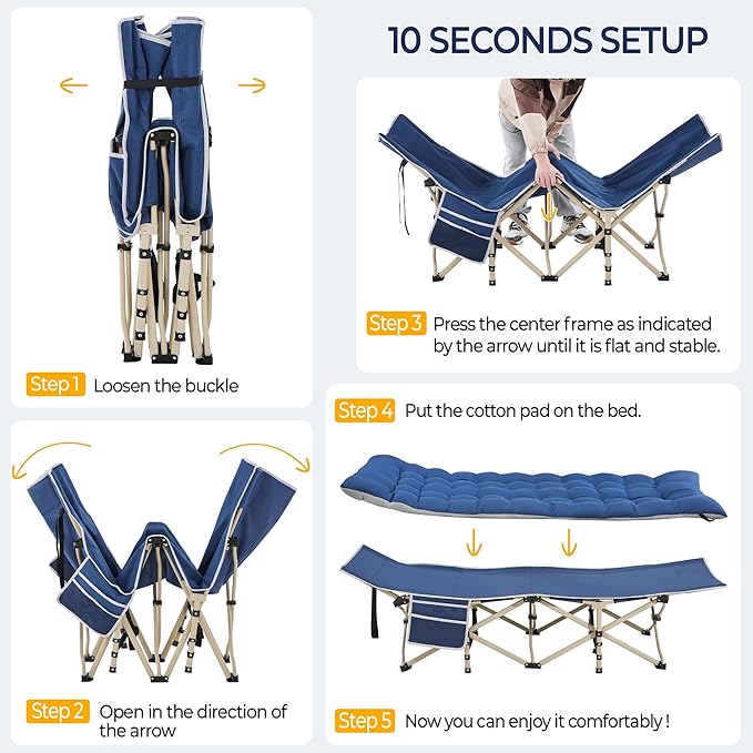 - Comfort-upgraded Camping Cot: This upgraded outdoor cot comes with an 8 cm/ 3.1" thick soft mat with a 90g Polyester cover and premium filling. To prevent the uneven distribution of the filling after using it for a while, outside the mat is sewn with thread vertically and horizontally, making the filling fixed in the specific area