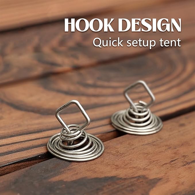 - 🐙[Slip & Adjustable Spring]:These deck nails are designed in an octopus shape, and the bottom double hook design creates stability better and prevents the nails from falling off or rotating due to the shaking of the tent. The telescopic spring shape can be adapted to decks of different thicknesses.The top is square, and it is easy to exert power in each direction.