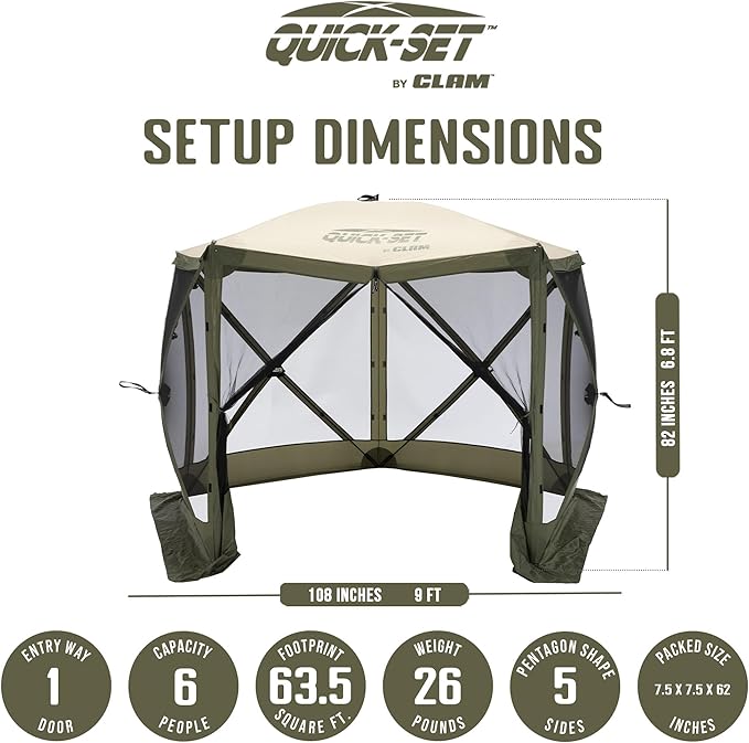 - Generous Dimensions: Set-up inner dimensions measure 9 feet across and 6.8 feet at center height; Hub to hub measures 108 inches wide and 108 inches long; Packed size measures 7.5 inches long by 7.5 inches wide by 5.2 feet tall