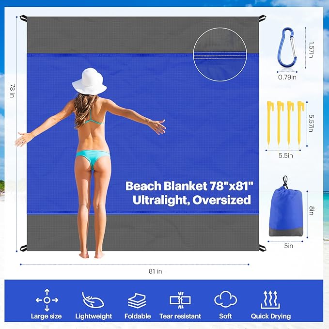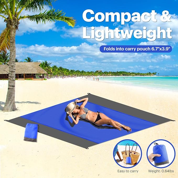 - LARGE SIZE DESIGN: The extra large beach mat is specially designed for family travel, providing enough space to lie down, rest and relax. Beach mat waterproof set includes 1 beach blanket, 4 stakes, 1 carabiner. Beach blanket measures 79" x 83", sleeps up to 7 adults, and weighs 12 oz.