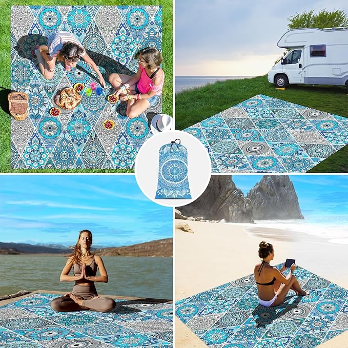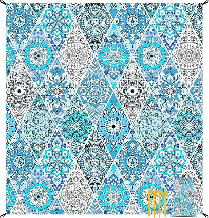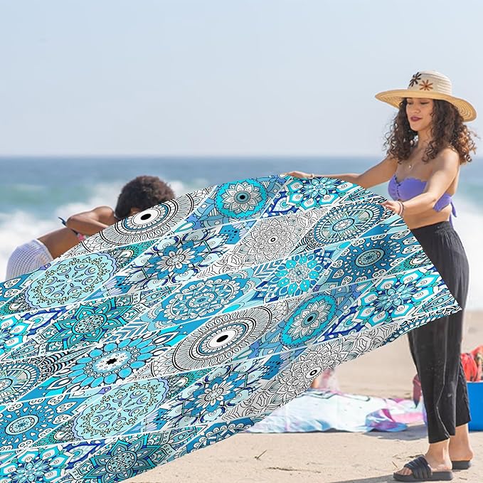 Teal Mandala Beach Blanket Waterproof Sandproof, Large Beach Mat Sand Free for 2-4 Adults, Lightweight Outdoor Picnic Blanket for Travel, Camping, Hiking, Essentials Accessories for Vacation