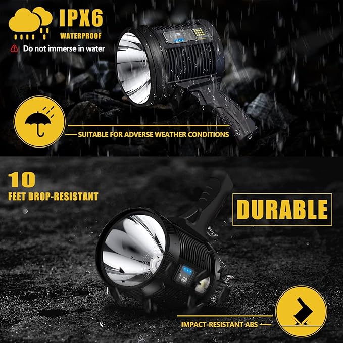 - WATERPROOFING: This handheld spotlight is rated IPX6 waterproof, meaning it can handle splashes from any direction. Perfect for outdoor adventures and tackling all sorts of nasty weather conditions.