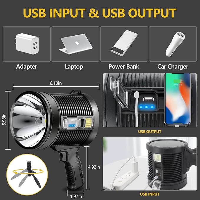 - BIG BATTERY POWER: This rechargeable spotlight comes with a hefty 15,000mAh battery that'll keep you going for over 15 hours straight. That means you can rely on it for those long outdoor adventures. And when it's time to juice it up, you can plug it into a USB wall charger, a USB car charger (takes about 4-5 hours), or even soak up some sun and charge it with solar power (around 10-20 hours).