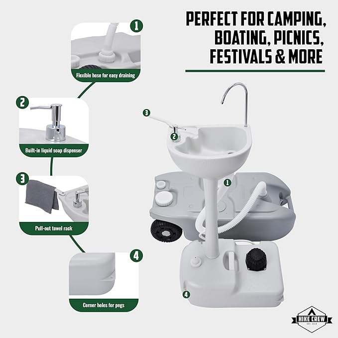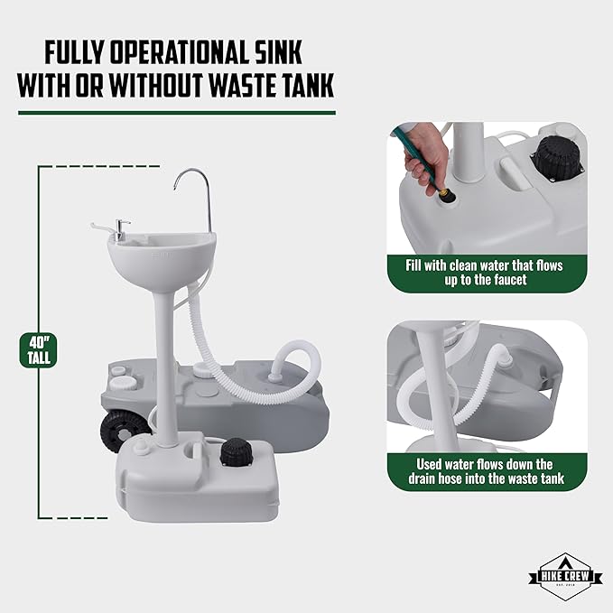 - PERFECT FOR CAMPING, BOATING & FESTIVALS | Hike Crew’s Versatile Personal Care Equipment Stands Up to Frequent Use & Suits a Variety of Outdoor Settings & Events Where Plumbing/Running Water is Not Available | Use Your Portable Sink & Waste Tank for Camping & Fishing Trips, RV Outings, Picnics, Concerts, Parties, Tailgates & Sporting Events