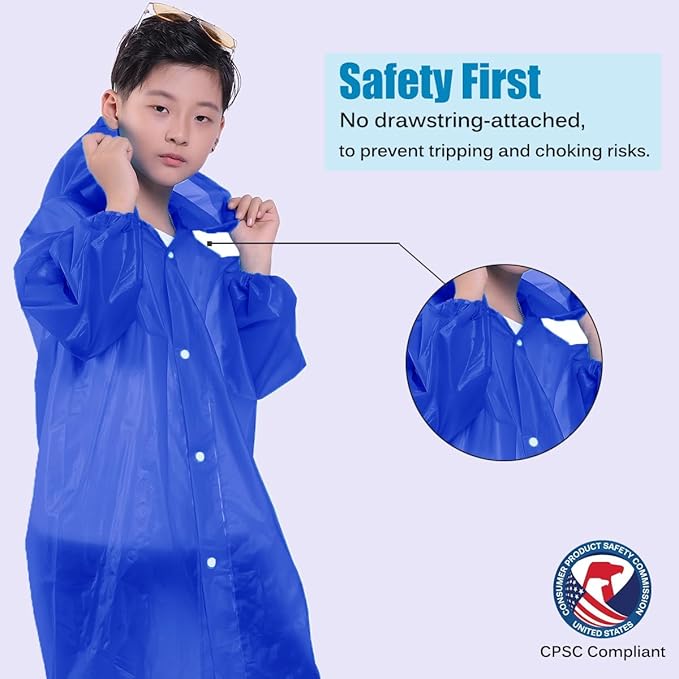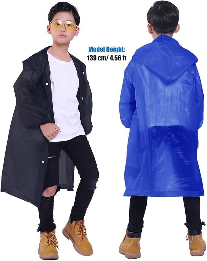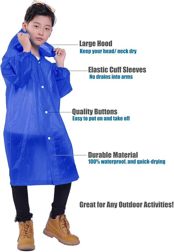 • Compact Emergency Protection: Our raincoat for girls and boys features a large hood, long sleeves, elastic cuffs, and snap buttons to keep you cool and dry in heavy rain. Easy to put on or take off, and fold for reuse. It saves space and reducing waste