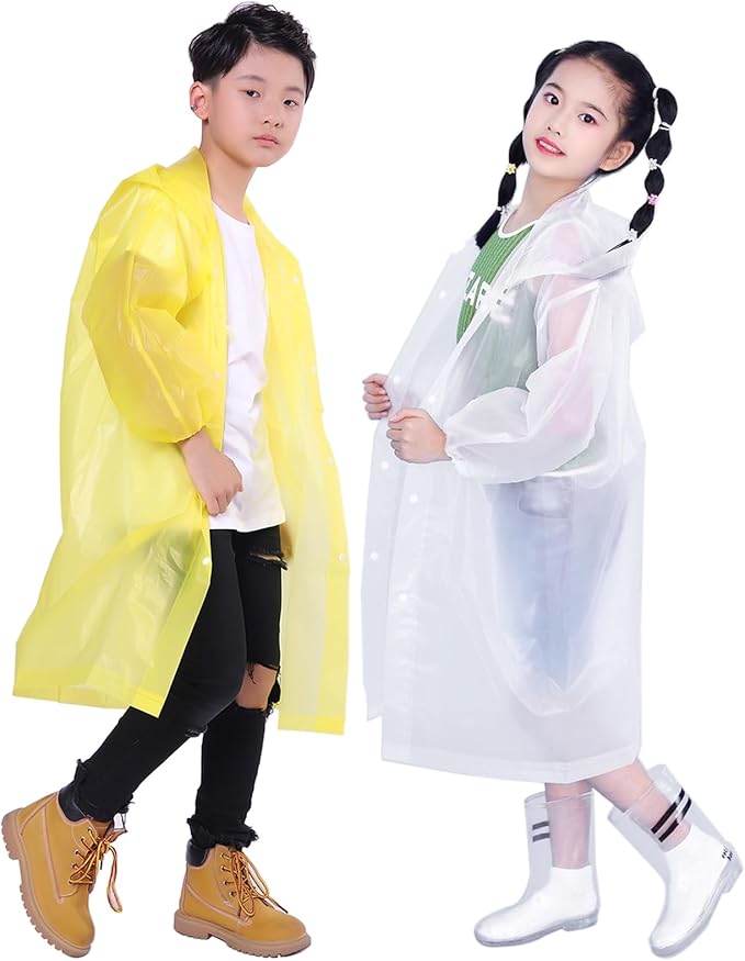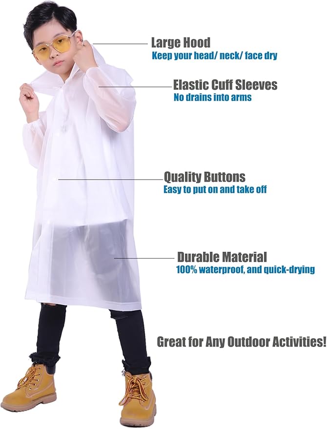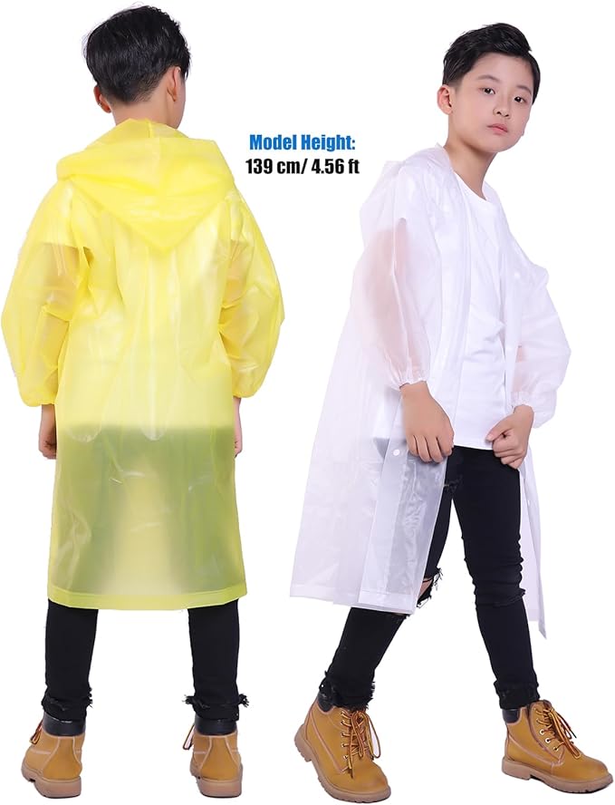 - Compact Emergency Protection: Our raincoat for girls and boys features a large hood, long sleeves, elastic cuffs, and snap buttons to keep you cool and dry in heavy rain. Easy to put on or take off, and fold for reuse. It saves space and reducing waste