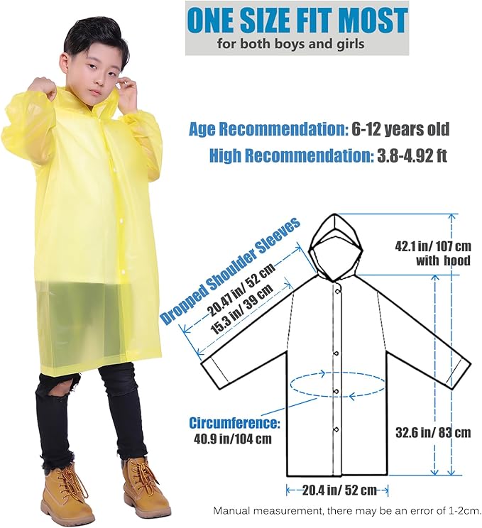 - One Size Fits Most: Measures 42.1" x 20.45" with a hood, suitable for children between 3.8-4.92 ft tall (typically ages 6 to 12). Confirm fit before ordering. For safety reasons, Makonus ponchos for kids are designed without drawstrings