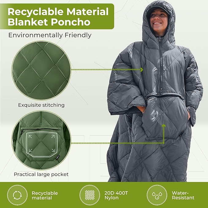 • HIGH-QUALITY RECYCLABLE MATERIAL: Made of 400T 20D Recyclable nylon and and Recyclable synthetic filling, Our blanket jacket combining soft, tear-resistant water-repellent and Environmental friendly.