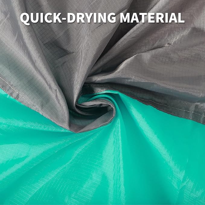 • EXTRA LARGE AND LIGHTWEIGHT: The extra large beach blanket at 108''*96'' can comfortably accommodate 6 adults. Mat comes with 4 fixing posts and 1 carabiner for easy hanging on the backpack. The weight is only 16 oz. It is extremely suitable for hiking, mountain climbing, outdoor picnics, or beaches.