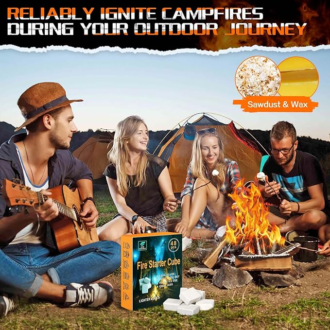 Fire Starter Squares for Campfires: All Weather Camping Fire Starters Cubes | Quick & Odorless Firestarters for Fireplaces | Wood Stove | Grills | Fire Pit | BBQ - 48 Count