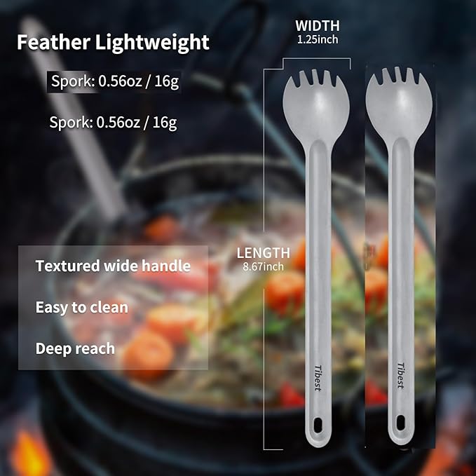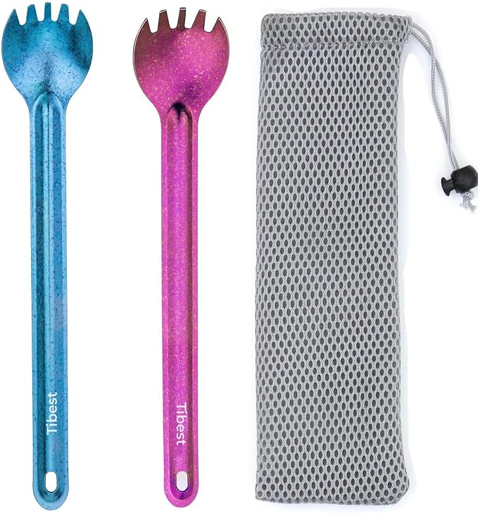 - What You Get: Titanium spoon long handle, Titanium spork and a mesh carry bag.