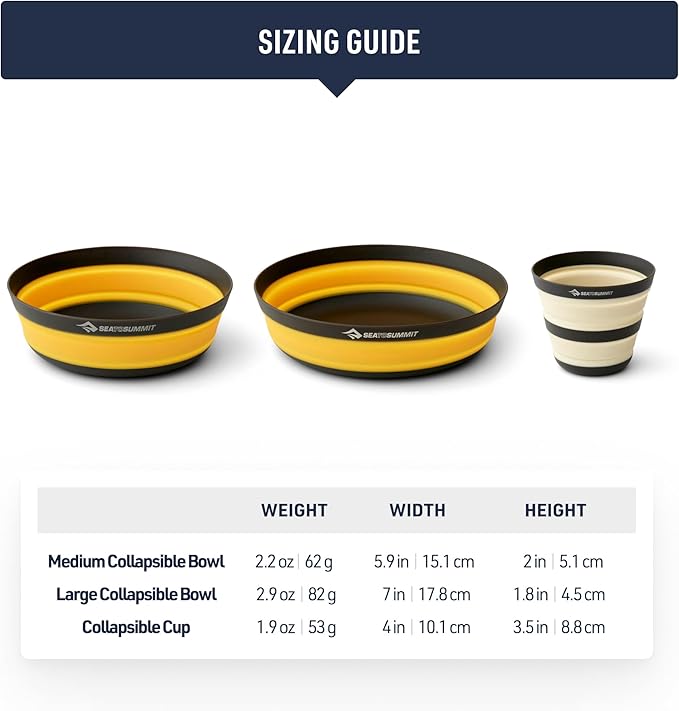- Collapsible 1-person mess kit includes a Medium Bowl, Large Bowl, and Medium Cup – all collapsible and ultra lightweight.