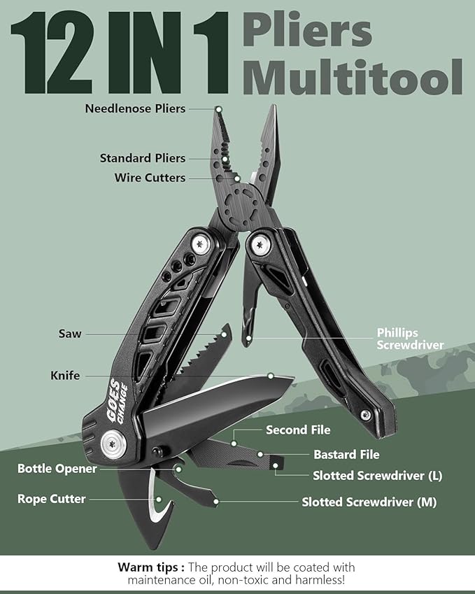 - All In One Tools: Featuring Needlenose Pliers, Standard Pliers, Wire Cutters, Knife, Slotted Screwdriver (M), Slotted Screwdriver (L), Phillips Screwdriver, Bastard File, Second File, Rope Cutter, Saw and Bottle Opner. 12 different tools can solve the various problems, almost all the job can be done when you have this multipurpose knife in your pocket.