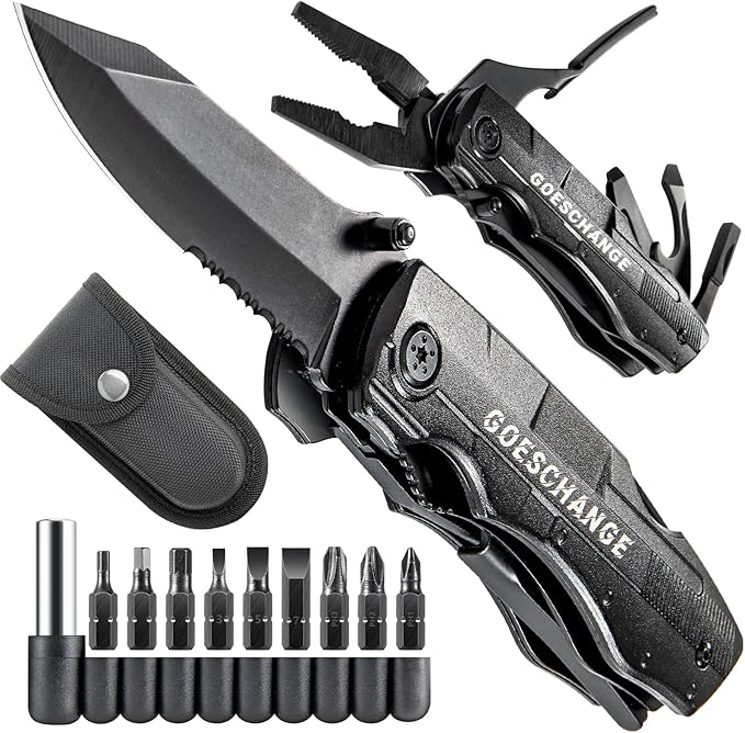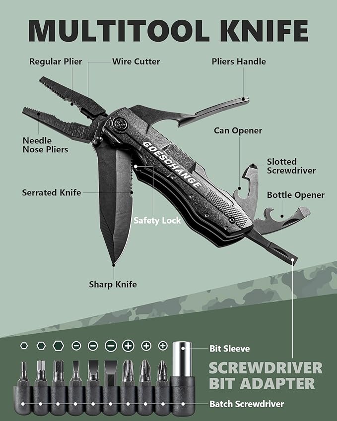 - 10-in-1 Multitool Set: Meet all your needs with this versatile tool set, featuring Needlenose Pliers, Regular Pliers, Wire Cutter, Serrated Knife, Can Opener, Slotted Screwdriver, Can Opener, Sharp Knife and multi kinds of Screwdrivers.