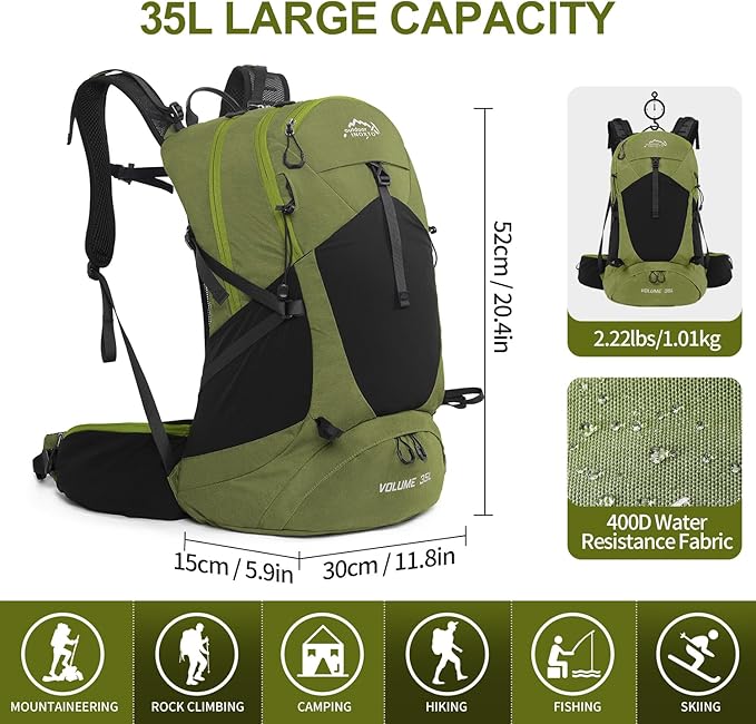 - 【Ergonomic Breathable Technology】Our Camping Backpack are 20.4 x 11.8 x 5.9 inches, 35L. Features a cutting-edge 3D touch suspension system that keeps your back comfortable and relaxed during travel. Breathable mesh on the back fabric can reduce sweating for extra comfort. Using steel frame support, the force is more evenly distributed, effectively alleviating the problems of muscle soreness caused by long-term weight bearing. Reflective design increases visibility and makes it safer at night.