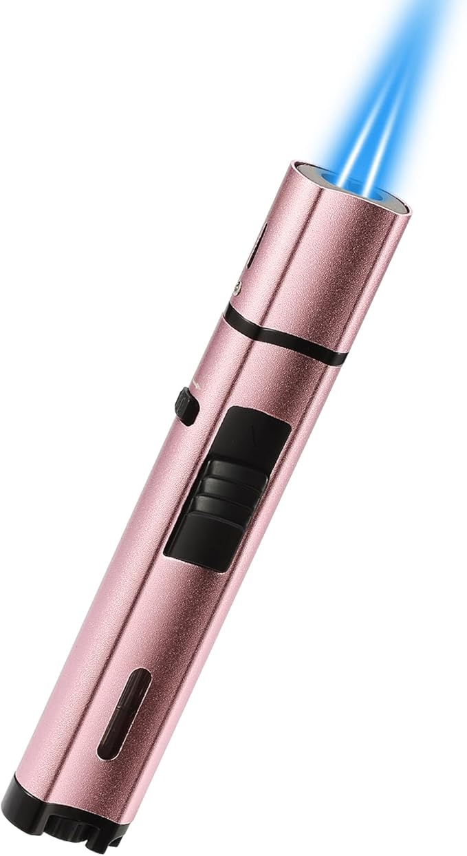 5.7in Butane Torch Lighter with Flame Locking & Safety Switch Function, Adjustable Double Jet Flame Long Stick Lighter, Refillable Windproof Pen Lighter. Rose Gold(Sold Without Gas)