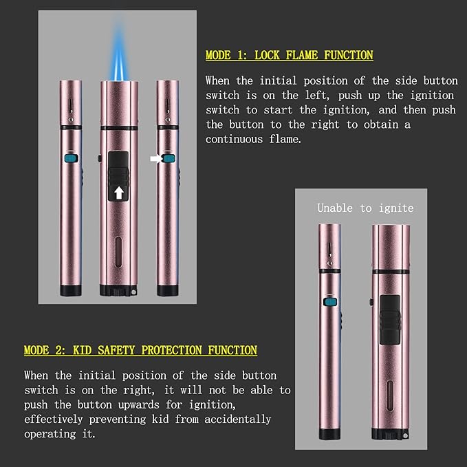- 🔥【ONE LIGHTER, 2 MODES】- MODE 1: Lock Flame Function, when the initial position of the side button switch is on the left, push up the ignition switch to start the ignition, and then push the button to the right to obtain a continuous flame. MODE 2: Kid Safety Protection Function, when the initial position of the side button switch is on the right, it will not be able to push the button upwards for ignition, effectively preventing kid from accidentally operating it.
