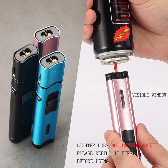 - 🔥【VISIBLE WINDOW & ADJUSTABLE FLAME】- Don't worry about when to refuel butane to the jet lighter. You can clearly see the remaining amount of fuel from the small window on the front, and you can check and fill it at any time. According to the design structure of the lighter, the maximum filling is about 70% of the total volume. The flame regulating valve is located at the bottom of the lighter. Rotate slightly left and right to adjust the size of the flame. Note the + and – signs.