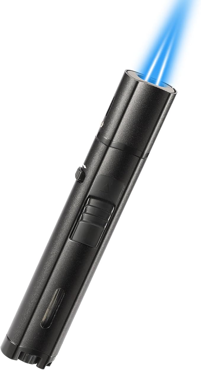 5.7in Butane Torch Lighter with Flame Locking & Safety Switch Function, Adjustable Double Jet Flame Long Stick Lighter, Refillable Windproof Pen Lighter. Black(Sold Without Gas)
