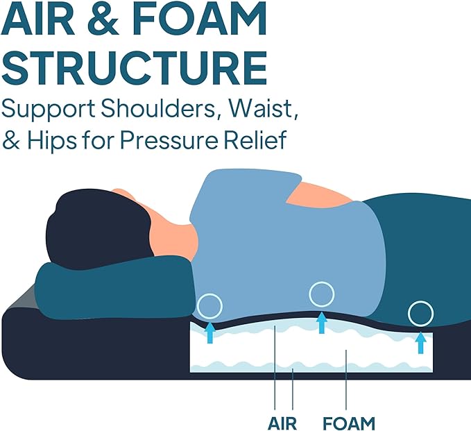 - 【Silent and Stable Support for Quality Sleep】The mattress provides a stable sleeping surface with minimal noise, ensuring that your movements won't disturb your sleep or your partner's. Unlike other air mattresses that may make annoying squeaking or rubbing sounds, this unique combination of air and foam construction keeps you comfortable and quiet throughout the night.